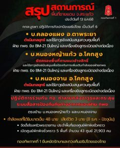 วันที่ 13 ธันวาคม 2568 ศูนย์ปฏิบัติการ กองทัพภาคที่ 1 สรุปสถานการณ์ชายแดนไทย-กัมพูชา พื้นที่ จ.สระแก้ว ประจำวัน 13 ธันวาคม 2568 เวลา 18.00 น.